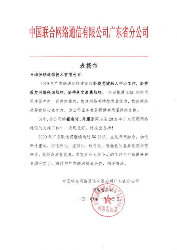 轉發(fā)“中國聯(lián)合網(wǎng)絡通信有限公司廣東省分公司網(wǎng)絡發(fā)展部”對我公司員工的一封表揚信
